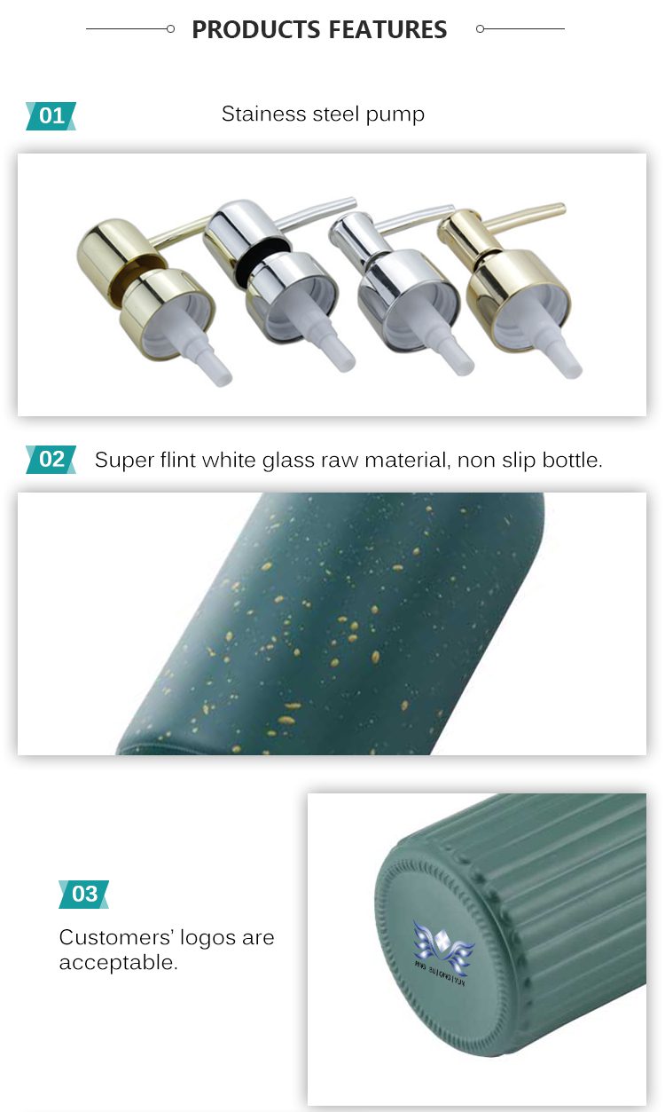 It features a high-quality stainless steel pump paired with a bottle made from super flint white glass, ensuring a brilliant appearance and a secure, non-slip grip. We accept customization of your logo for effective branding. The bottle is highly resistant to heat and force, guaranteeing health safety and long-term reliability. With its attractive design, top-tier quality, and competitive price, it offers excellent value. We provide various specifications to perfectly meet our clients’ specific requirements.
